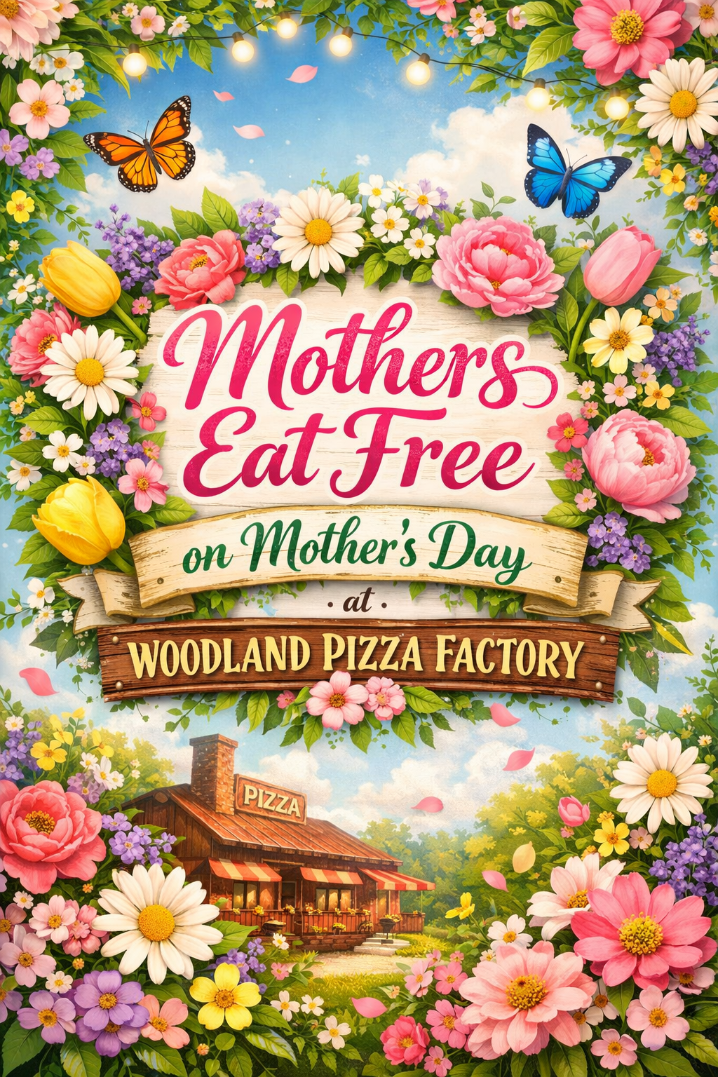 Food & DrinkMothers eat free on Mother’s Day at the woodland pizza factory!! We will be having our all you can eat buffet from 11am to 8pm Sunday for Mother’s Day and all mothers can get a free buffet!!