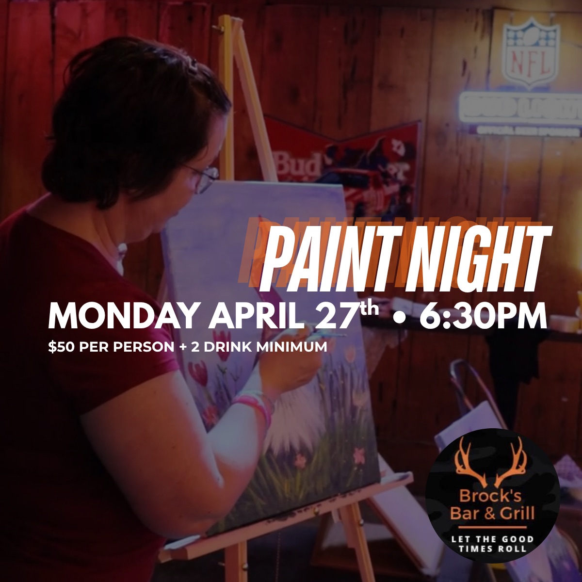 Paint Night is coming back to Brock’s 🎨 April 27th at 6:30. (These always fill up quick!!) $50 gets you everything you need (canvas, supplies, step-by-step instruction)… just bring yourself and plan on a couple drinks (2 drink minimum) while you’re here. Spots are limited and they do sell out quickly, so if you’ve been... |
