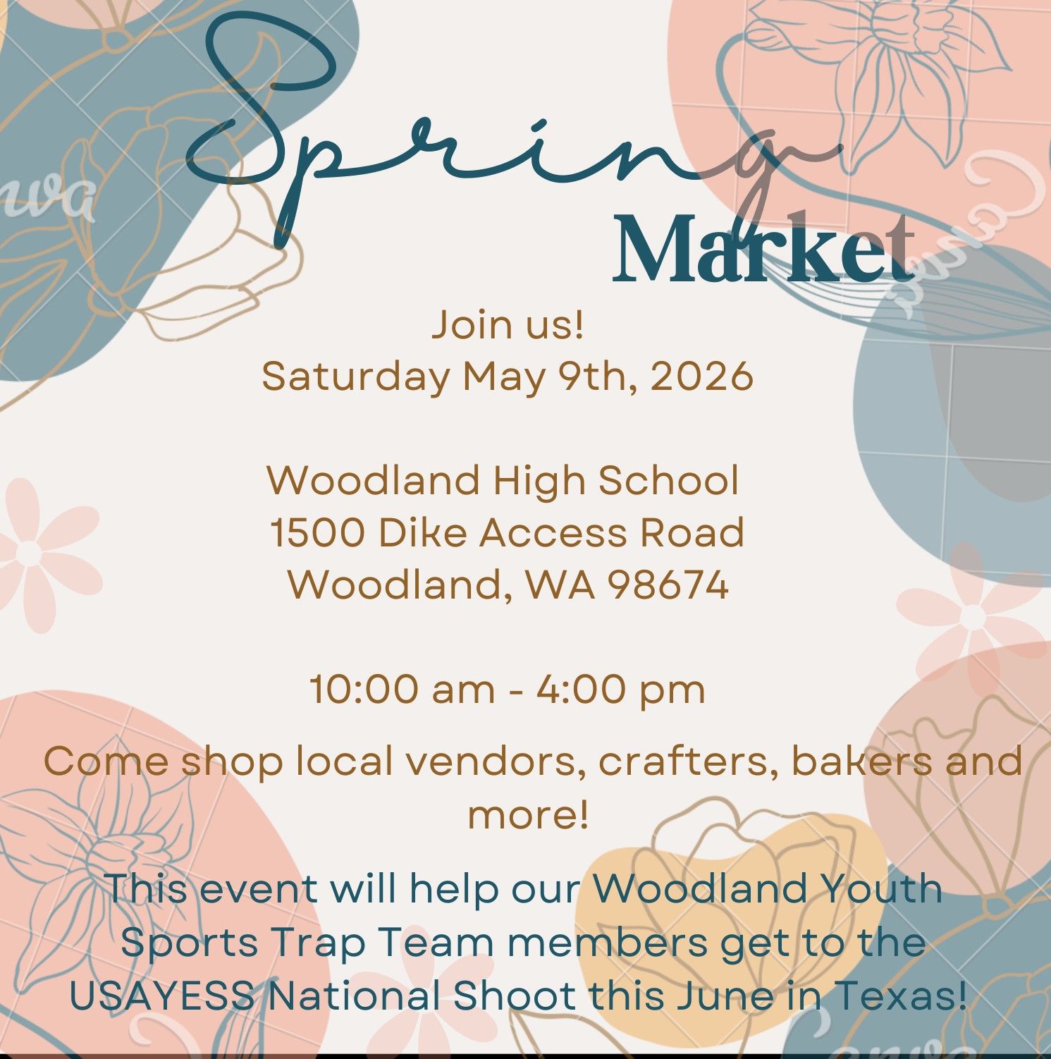 Woodland High SchoolJoin us for our third annual Spring Market! The Spring Market helps raise funds for our local Woodland Youth Sports Trap Team members that are going to shoot on the national stage in June down in San Antonio, TX! We will have numerous vendors to shop from and we hope to see you all there!...